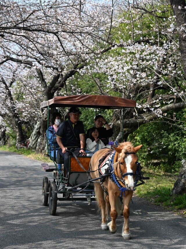 満開の桜並木を行く馬車体験